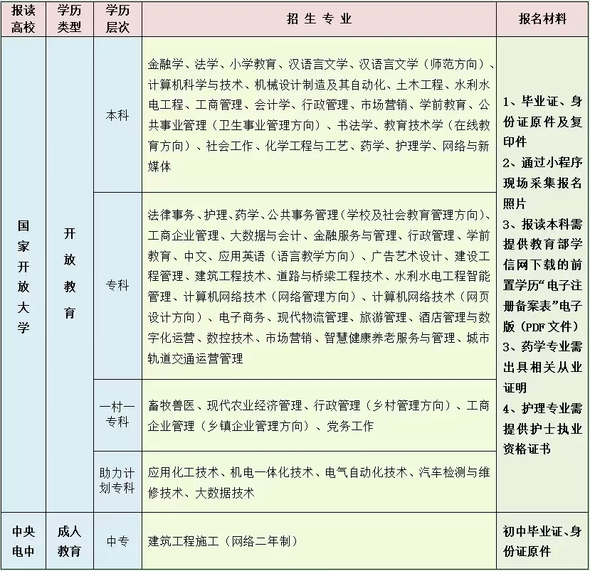威海市文登开放大学(原文登广播电视大学)与威海市文登技师学院、威海市文登区职业中等专业学校共处一校,是一所公办的综合性院校。学校开设成人教育本科、专科、成人中专等层次的学历教育,目前在读学员3000多人。开放教育本科、专科由国家开放大学(原中央广播电视大学)颁发毕业证书,成人中专由中央广播电视中等专业学校颁发毕业证书。 一、招生对象 学历及年龄要求:年满17周岁的高中、中专、技工及以上学历者可报读专科;年满19周岁的国民教育系列专科及以上学历者可报读本科;年满16周岁的初中及以上学历可报读两年制成人中专。 二、招生学校及专业 备注:山东省外户口需提交社保卡、暂住证或单位出具的工作证明及本人现场照片。 三、学习与考试 以网上学习为主,考核方式灵活,形式主要有作业考核、网上考核、纸质考核等。期末考试每年两次,一般在1月上旬和7月上旬左右进行,考试时间由高校统一安排,我校具体组织。 四、毕业及颁证 专科、本科最短学习年限为2.5年(学籍最长保留8年)。学习期满成绩合格颁发国家承认的本、专科毕业证书。学籍及毕业信息均可在教育部学信网(http://www.chsi.com.cn/)上查询。本科学员达到学位授予标准的,可申请高校颁发学士学位证书。成人中专最短学习年限为两年。 五、收费标准 六、奖助学金制度 学校每年开展奖(助)学金、优秀毕业生评选活动,奖优奖强、助贫助困。优秀学生可申请奖学金;身体残疾、生活困难或在校期间遭遇重大变故的学生可以申请助学金;学习上品学兼优,工作中积极进取、率先垂范的学生可以参加优秀毕业生评选。学校设有“续航激励金”。符合条件的单位一线职工还可以申请威海市总工会的“求学圆梦行动”补助金。