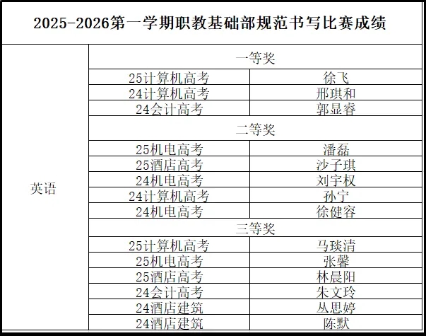 为全面检验规范书写训练成果,提升学生答题规范性,营造“以赛促学、以赛促练”的浓厚氛围,职教基础部于近期举办了规范书写比赛,24、25级的38名书写小能手齐聚一堂,展纸挥毫,一较高下! 各展所长,赛场竞技显真章 比赛分语文、数学、英语三个学科进行,统一命题、限时完成,考查学生的书写功底与答题规范程度。现场同学们全神贯注,笔下生风。有的同学字迹清秀如溪流,有的同学布局合理如乐章,每一张作品都凝聚着专注与态度。 荣耀时刻,表彰优秀尚新风 1月19日,职教基础部召开系部全体学生大会,对规范书写比赛获奖学生进行了表彰。比赛共评选出一等奖9名,二等奖13名,三等奖16名。获奖的优秀作品充分展示了选手们认真的态度、规范的书写和扎实的基本功。 笔墨塑人,规范立风。自规范书写训练开展以来,职教基础部围绕答题意识、技巧方法与书写实践三大板块,强化学生规范书写意识,减少非智力失分,提升卷面整洁度与答题逻辑性,营造“写好字、做好题、得高分”的学习氛围,系统推进规范化书写教学。 愿每一位同学,落笔有序,行文有格,在方寸纸间,书写自己的风采与未来。