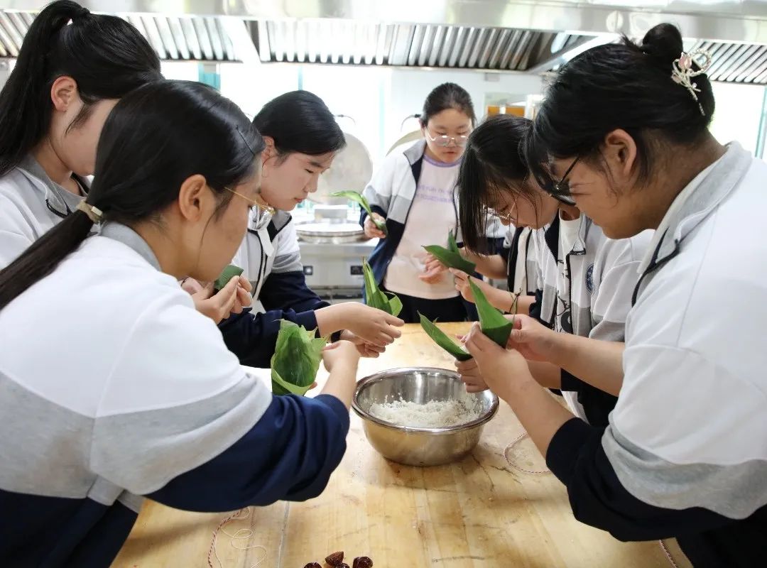 为进一步培养学生的学习能力和劳动技能,老师们精心准备了包粽子需要的所有材料,把提前泡好的糯米、蜜饯、粽叶等材料整齐摆放在桌子上,在老师的认真讲解下,各位“能工巧匠”和“新手小白”围在一起,拿上幸福粽叶,装上吉祥糯米,塞好如意红枣,捆上开心红绳,将食材变成了一个个精致饱满的粽子。