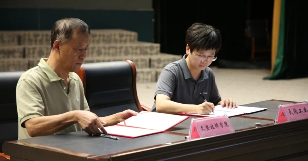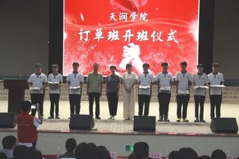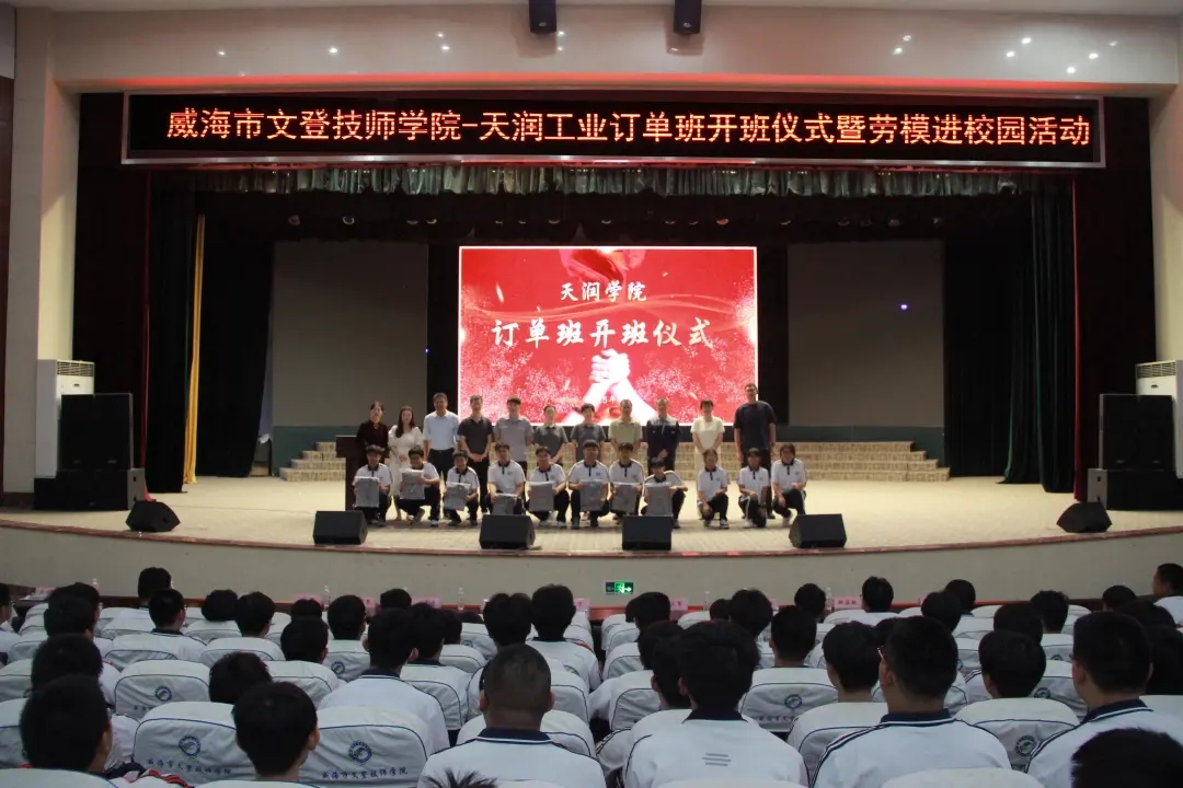 9月18日,以“技能成就人生,匠心筑梦未来”为主题,由我校与天润工业技术股份有限公司联合举办的订单班开班仪式暨劳模进校园活动在学院礼堂隆重举行,标志着双方在产教融合领域的深度合作迈入新阶段。 强强联合 共育高技能人才    上午10时,活动在招生就业培训处副主任周文静的主持下拉开帷幕。校企双方代表--学院招生就业培训处主任杨庆军与天润工业人力总监包宁共同签署订单班培养协议,订单班将围绕数控技术、工业机器人等专业,定向培养企业急需的复合型技能人才。    杨庆军在致辞中强调:订单班是落实职业教育服务区域经济战略的重要实践,通过企业课程植入、双师授课等模式,真正实现毕业即就业的无缝衔接。天润工业代表丛艳副经理表示,企业将通过配备生产骨干担任实践导师,全程指导实习实训,引入生产式订单教学,让同学们参与真实生产任务,提升实操能力等多种措施为订单班提供全方位支持。 匠心传承 点亮技能之光    仪式上,校企领导为2025级新生赠送定制工装,象征着由学生向准产业人的身份转变。    机电工程系数控车间主任李晓东从企业用人标准角度,剖析了工匠精神的时代内涵。学生代表王鹏涵动情地说:这份工装承载着校企的期待,我们将以周军雷大师为榜样,用技能改写人生。    威海市技术能手、天润工业技能大师,我校优秀毕业生周军雷以《技能成就自我》为题,分享了从普通工人到行业领军的成长历程。他用刻苦钻研,不断进取的故事诠释执着专注的工匠精神,现场掌声经久不息。 产教融合 服务区域发展    机电工程系数控技术、工业机器人专业共计450余名师生参与了本次活动。近年来,我校先后已与吉利汽车、京东物流、天润工业等30余家龙头企业签署订单培养协议,订单班毕业生就业率连续三年保持98%以上。此次合作将进一步提升人才培养与产业链的契合度,为威海制造业高质量发展注入新动能。