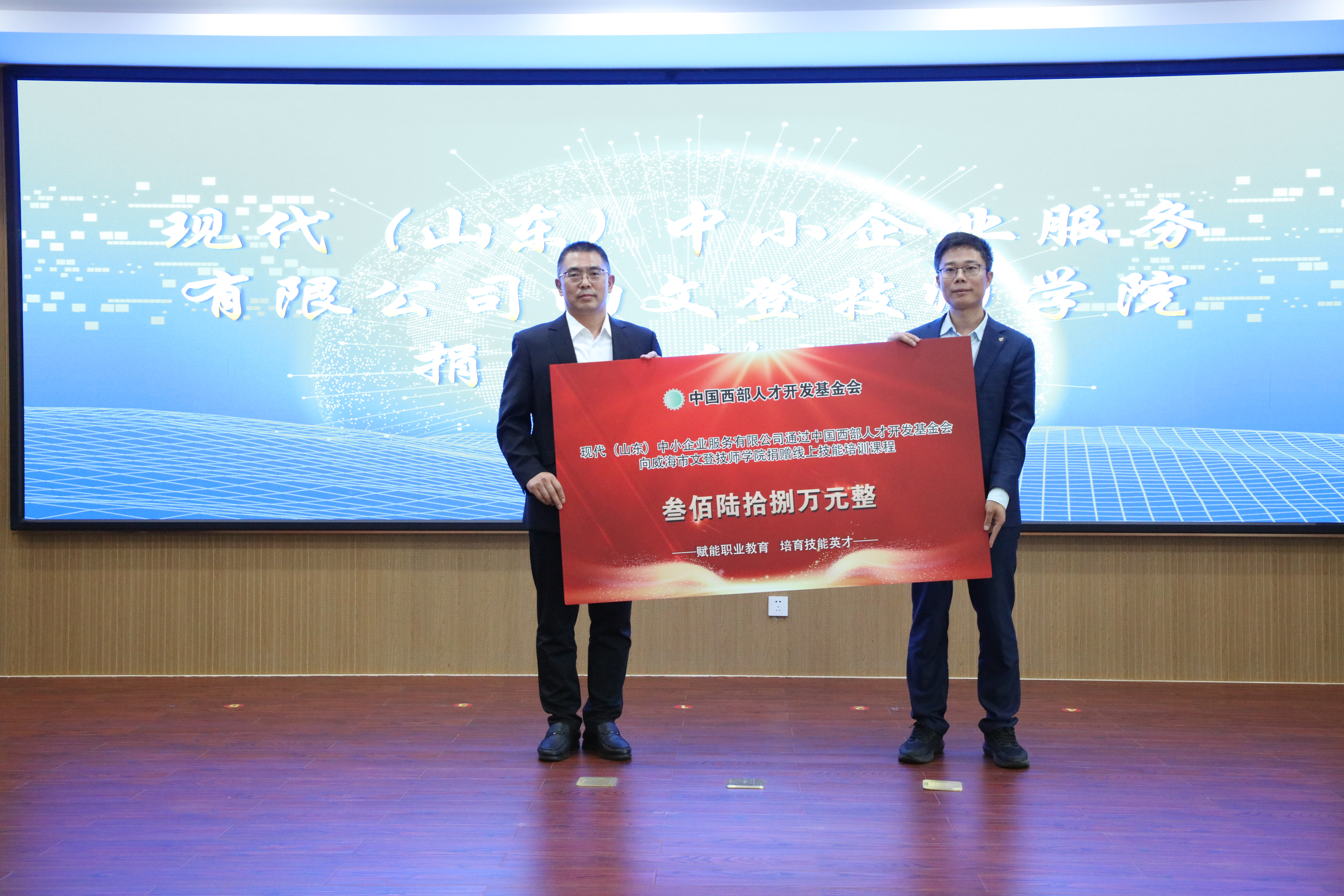 9月23日下午,2025年中东欧高价值成果创新合作大会平行会议“仿生科普深融、产业新质发展”在吉林大学威海仿生研究院学术报告厅隆重举行。会议现场,现代(山东)中小企业服务有限公司通过中国西部人才开发基金会,向我校捐赠价值368万元的“现代智训学堂”线上技能培训课程资源,为职业教育数字化发展注入新动力。    2025年中东欧高价值成果创新合作大会以“智联中东欧,共筑科技合作新未来”为主题,汇聚了来自中国与中东欧国家的院士专家、科研机构和企业代表,共同探讨科技创新与产业升级路径。本次捐赠活动作为吉林大学威海仿生研究院全国科普月系列活动“仿生科普深融、产业新质发展”议程之一,展现了职业教育与国际科技交流融合发展的新趋势。    此次校企合作项目的落地,不仅为我校学生提供了前沿的数字化学习资源,也为探索“科技+职业教育”创新模式提供了实践范例。    未来,我校将充分利用“现代智训学堂”优质课程,推动教学方式智能化转型,为学生拓展更广阔的职业发展路径,为区域产业升级持续输送高素质技术技能人才。    中国西部人才开发基金会是经国务院批准,中共中央党校(国家行政学院)业务主管的全国性公募基金会。基金会聚焦人才开发,致力公益慈善,服务西部大开发战略、乡村振兴战略和新时代人才强国战略;支持为西部大开发、乡村振兴和深入实施新时代人才强国战略服务的人才培养与培训、科学研究和政策咨询等活动;为西部大开发、乡村振兴和建设人才强国提供人才和智力支撑。    现代(山东)中小企业服务有限公司作为国家人社部评选的全国100家优质“互联网+职业技能培训”平台企业之一,其自主研发的“现代智训学堂”融合大数据与人工智能技术,数字化培训体系课程矩阵覆盖59个专业领域、116门课程,构建了“学习-实习-就业-晋升”全周期在线培训平台,精准匹配市场需求的教学体系,成为企业人才培养与个人职业发展的“数字枢纽”。